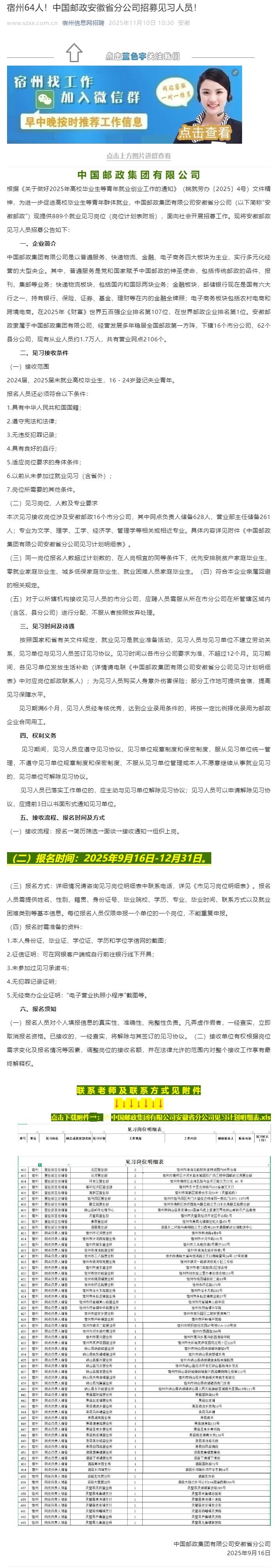 宿州64人!中国宿州64邮政安徽省分公司邮政安徽招募见习人员!