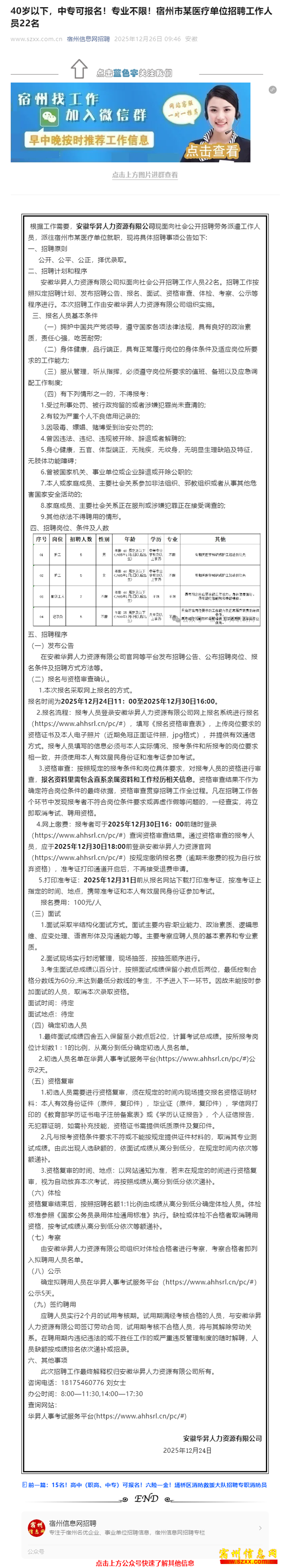 40岁以下,中专可报名!专业不限!宿州市某医疗单位招聘